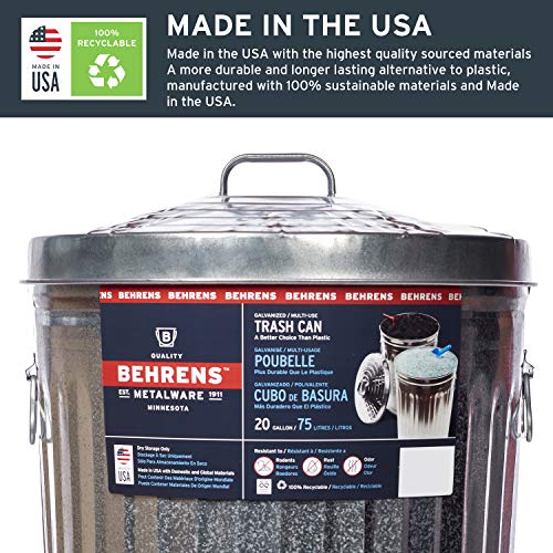 Made in the USA. Behrens industrial strength garbage cans with solid steel handles and a tight fitting lid are ideal for trash, yard waste, seed, and pet food/livestock storage